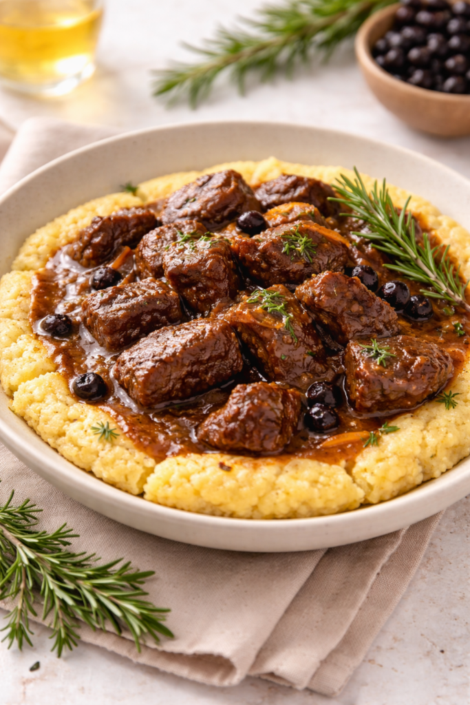 A tavola, il capriolo in umido non arriva mai da solo. Si appoggia su una polenta morbida, accoglie il suo sugo, si lascia condividere. Il vino nel bicchiere è lo stesso che ha attraversato la cottura, come a chiudere un cerchio.